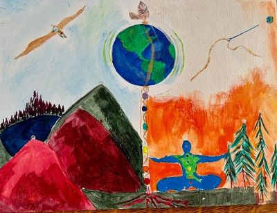 This painting is divided into various sections that represent the elements of earth, water, air and fire, as well as a closer look at bead, thread, divine human being, The symbols that are strongly represented are the green reed,which I see in the stick part of the prayer stick, and the torus loop as the forcefield around the bead/earth, the red steps, because it was created in steps, the blue circle of magic in the bead/earth. The bead is the earth, and the person is the earth too.The chakras are represented in the beads of the prayer stick and in the person. The bird heralds the new world. The thread is our lives. I have depicted the prayer stick is a bit like a tree because it has roots, I have included the colors of all the threads.
